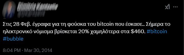 Το 2013 και το 2014, το bitcoin άρχισε να τραβά την προσοχή ως ένα πρωτοποριακό ψηφιακό νόμισμα. Η τιμή του είχε ανέβει εντυπωσιακά, φτάνοντας περίπου στα 500 ευρώ, γεγονός που είχε προκαλέσει τεράστια συζήτηση. Παρά την αρχική επιτυχία, το bitcoin συναντούσε μεγάλο σκεπτικισμό, ειδικά στα social media, όπου αρκετοί Έλληνες χρήστες θεωρούσαν ότι ήταν απλά άλλη μια “φούσκα” που θα έσκαγε σύντομα.