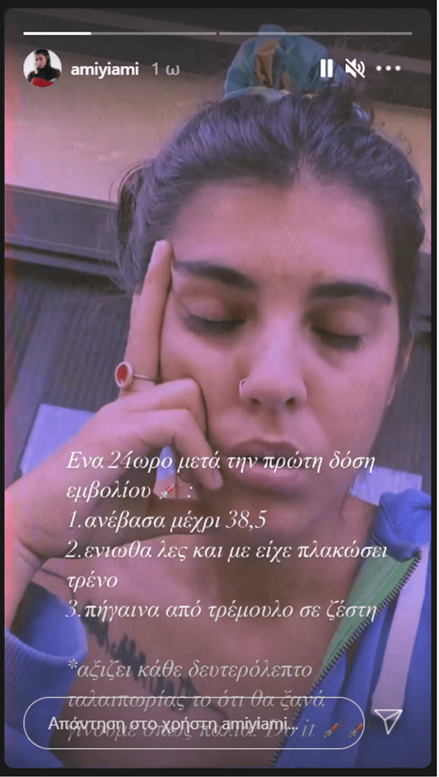 Πάντως ένα 24ωρο μετά τον εμβολιασμό με νέα της ανάρτηση ενημέρωσε πως είχε τις παρενέργειες του Astrazeneca, όπως πυρετό και κόπωση. Αλλά όπως λέει δεν το μετάνιωσε καθώς άξιζε τον κόπο.