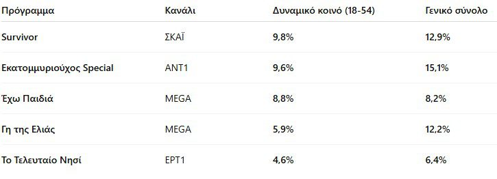 Σταθερά στην πρώτη θέση παραμένει το Monobala του ΣΚΑΪ, επιβεβαιώνοντας ότι κρατά τον έλεγχο τόσο στο δυναμικό κοινό όσο και στο γενικό σύνολο. Με 9% στο δυναμικό και 7,9% στο γενικό, η εκπομπή συνεχίζει να οδηγεί την κούρσα χωρίς ουσιαστική απειλή.