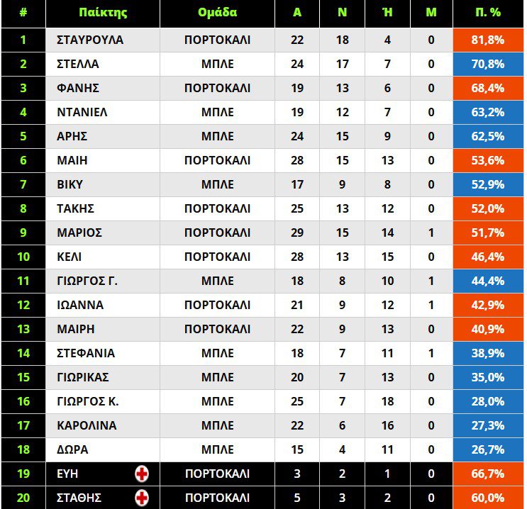 Η Στέλλα Ανδρεάδου από τους μπλε είναι αυτή που την ακολουθεί. Ούτε μακριά, ούτε κοντά δεν είναι η παίκτρια των μπλε. Στους άνδρες οι Φάνης, Ντάνιελ και Άρης είναι αυτοί που οδηγούν την κούρσα. Όλα αυτά παίζουν ρόλο όταν έρθει η ώρα και των αποχωρήσεων.