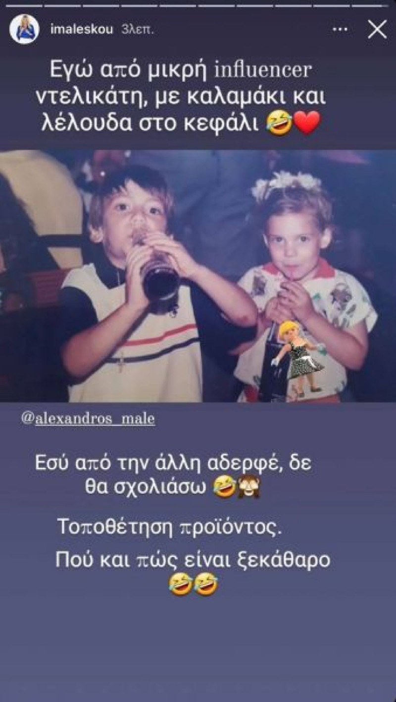 Αυτή τη φορά όμως η παρουσιάστρια του Love it είπε να κάνει ένα throwback και να ποστάρει μια φωτογραφία από την παιδική της ηλικία, στην οποία ποζάρει με τον αδερφό της, Αλέξανδρο. «Εγώ από μικρή influencer ντελικάτη, με καλαμάκι και λέλουδα στο κεφάλι. Εσύ από την άλλη αδερφέ, δε θα σχολιάσω. Τοποθέτησε προϊόντος. Που και πως είναι ξεκάθαρο», έγραψε χαρακτηριστικά η Ιωάννα Μαλέσκου στη φωτογραφία που κοινοποίησε.