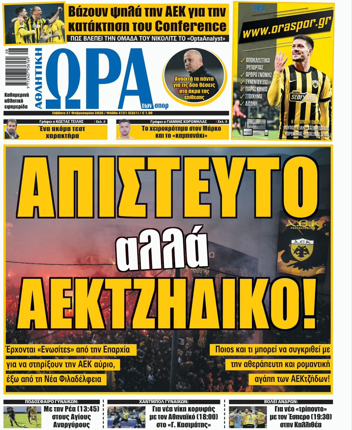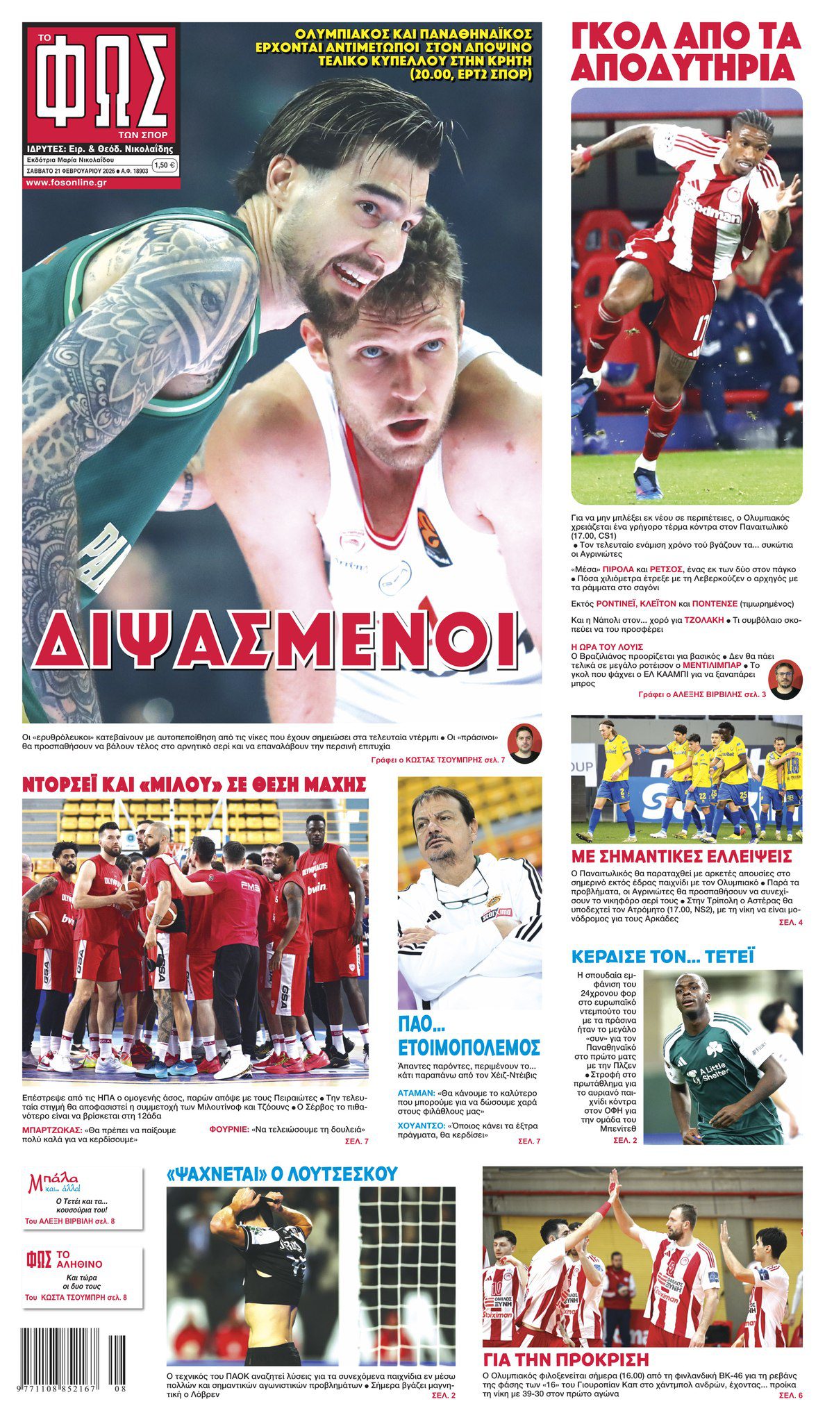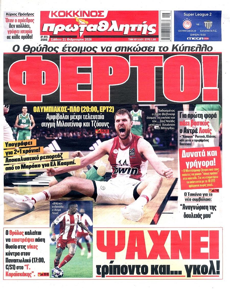 Πρωτοσέλιδα αθλητικών εφημερίδων για Σάββατο 21 Φεβρουαρίου 2026