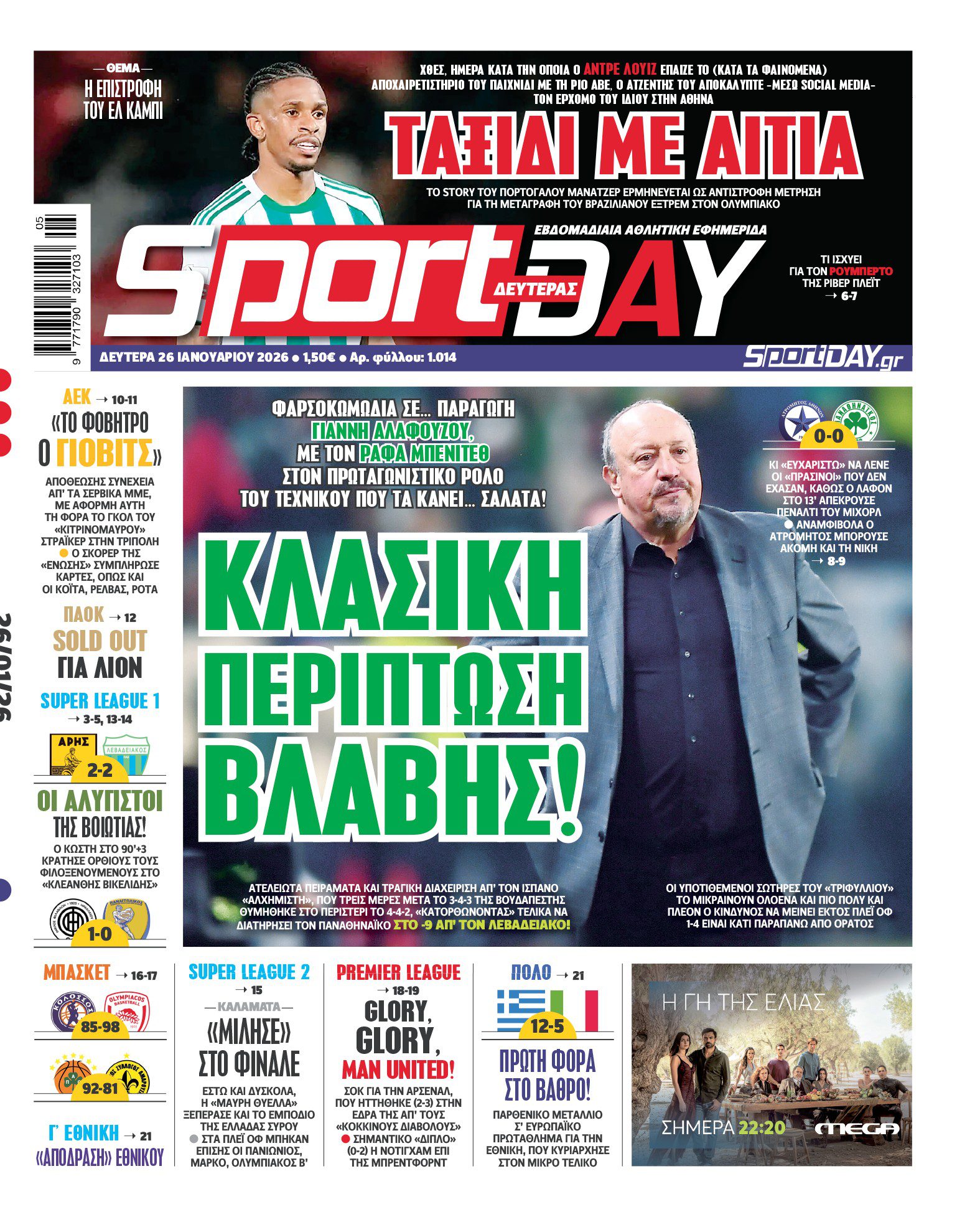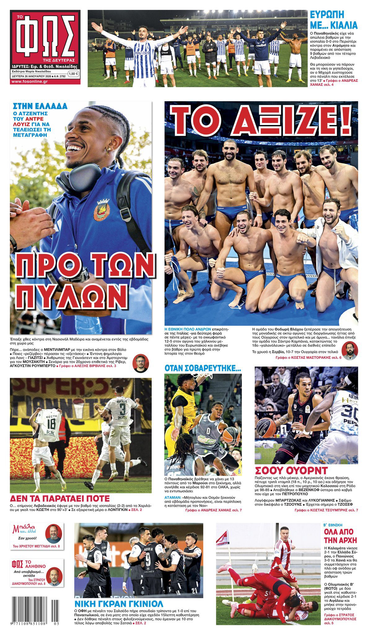 Πρωτοσέλιδα αθλητικών εφημερίδων για τη Δευτέρα 26 Ιανουαρίου 2026