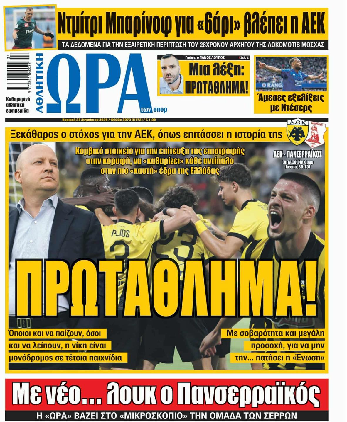 Πρωτοσέλιδα αθλητικών εφημερίδων για την Κυριακη 24 Αυγούστου 2025.