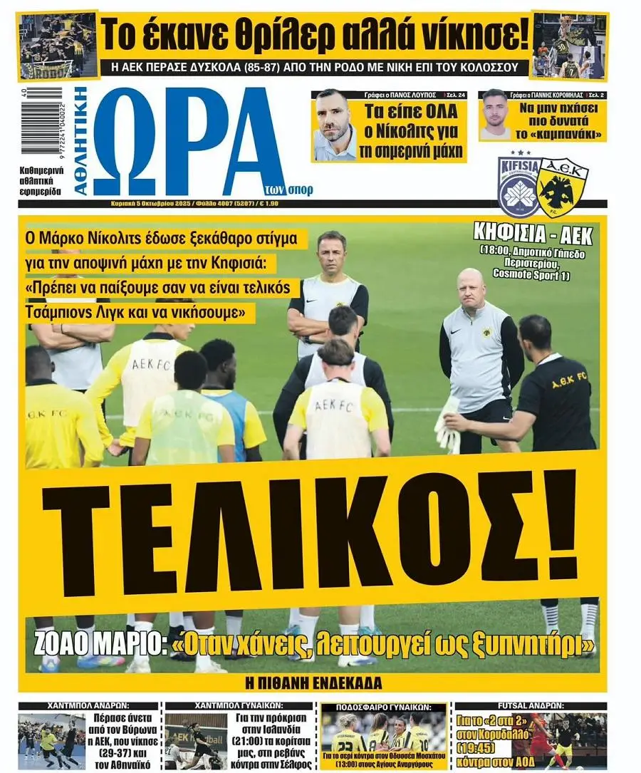 Πρωτοσέλιδα αθλητικών εφημερίδων για την Κυριακή 5 Οκτωβρίου 2025.