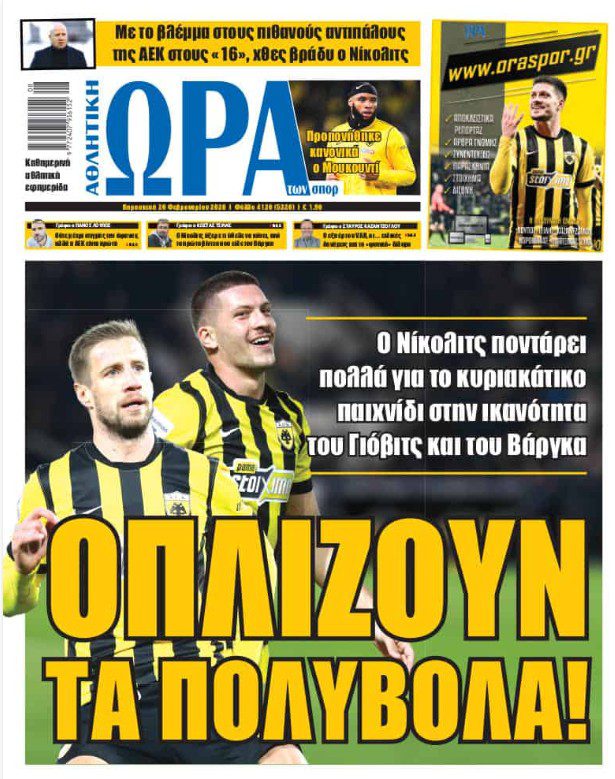 Πρωτοσέλιδα αθλητικών εφημερίδων για την Παρασκευή 20 Φεβρουαρίου 2026