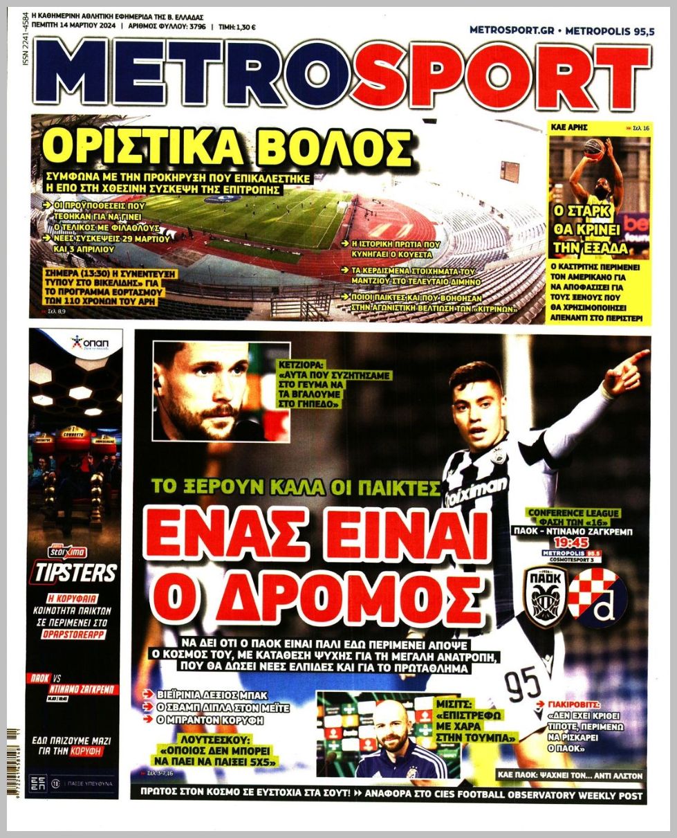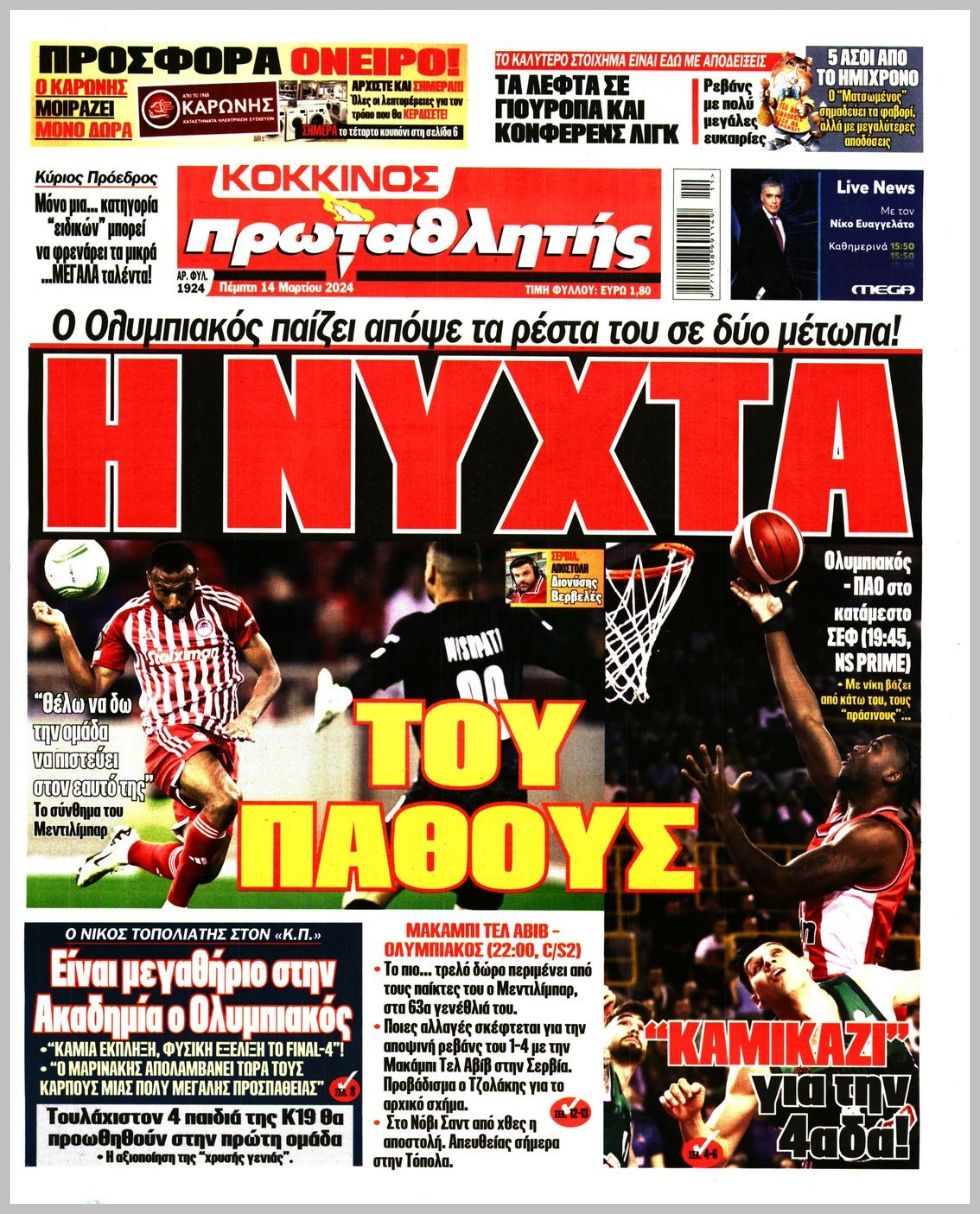 Πρωτοσέλιδα αθλητικών εφημερίδων για την Πέμπτη 14 Μαρτίου 2024