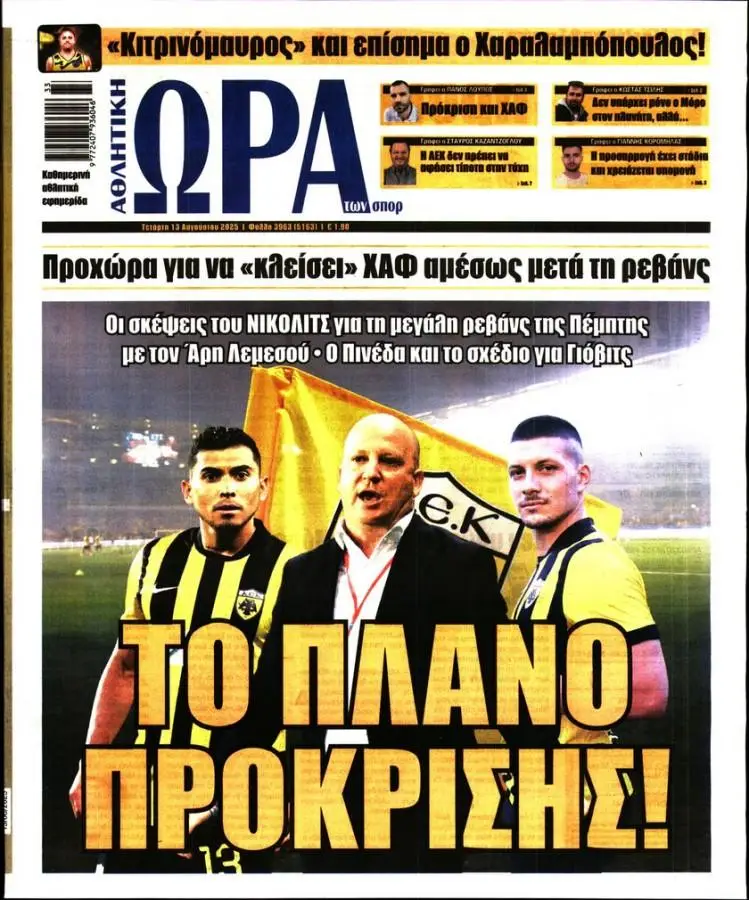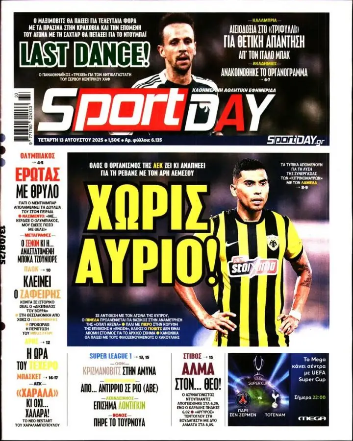 Πρωτοσέλιδα αθλητικών εφημερίδων για την Τετάρτη 13 Αυγούστου 2025