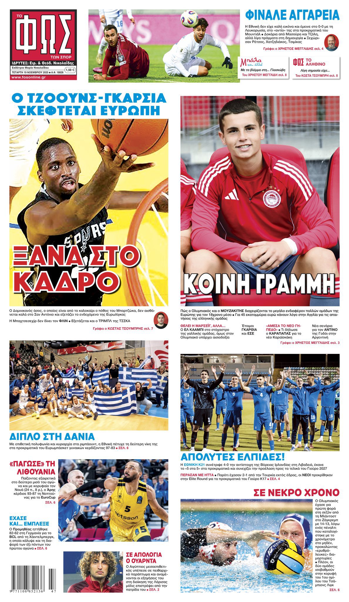 Πρωτοσέλιδα αθλητικών εφημερίδων για την Τετάρτη 19 Νοεμβρίου 2025.