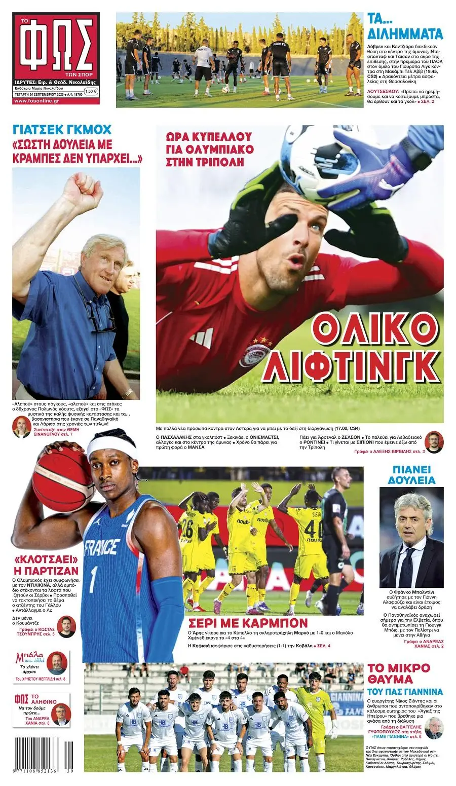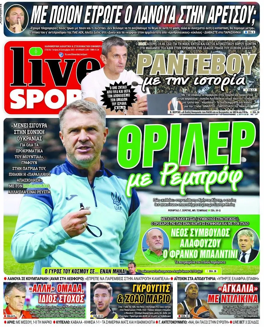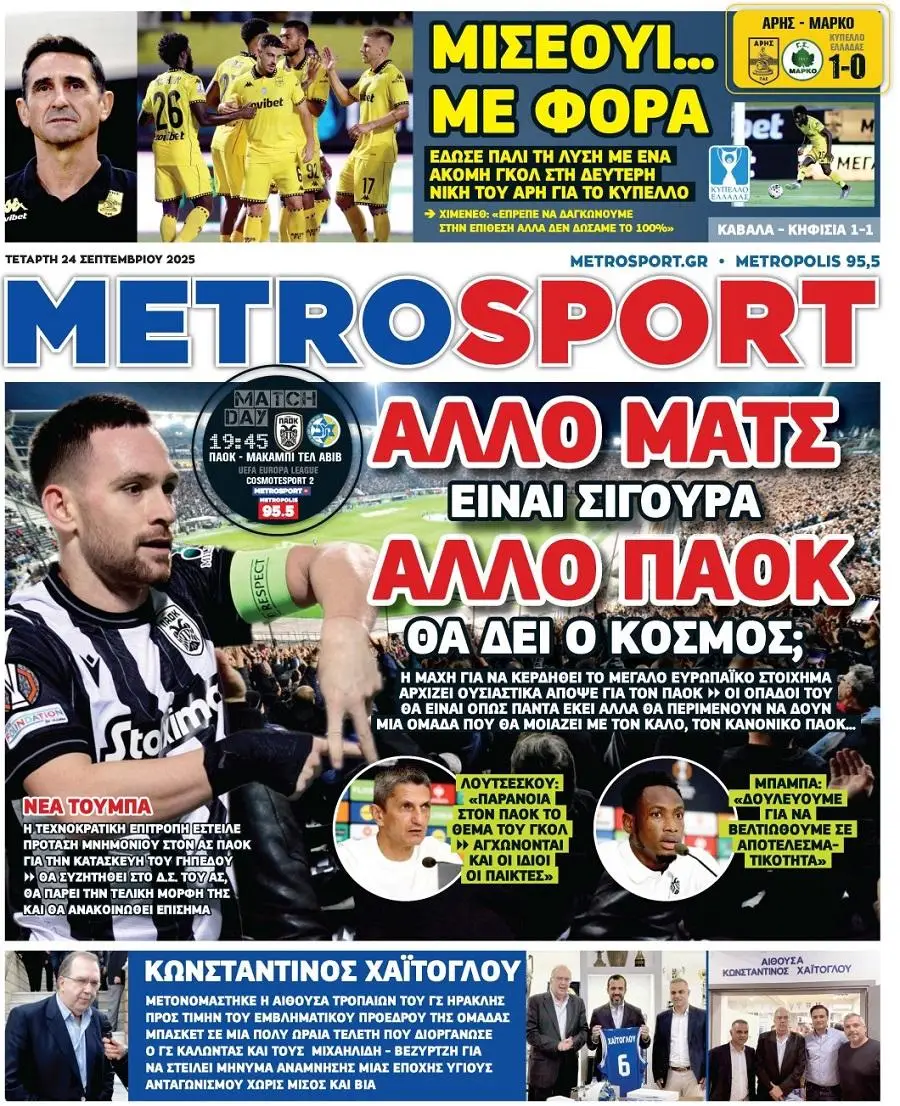 Πρωτοσέλιδα αθλητικών εφημερίδων για την Τετάρτη 24 Σεπτεμβρίου 2025