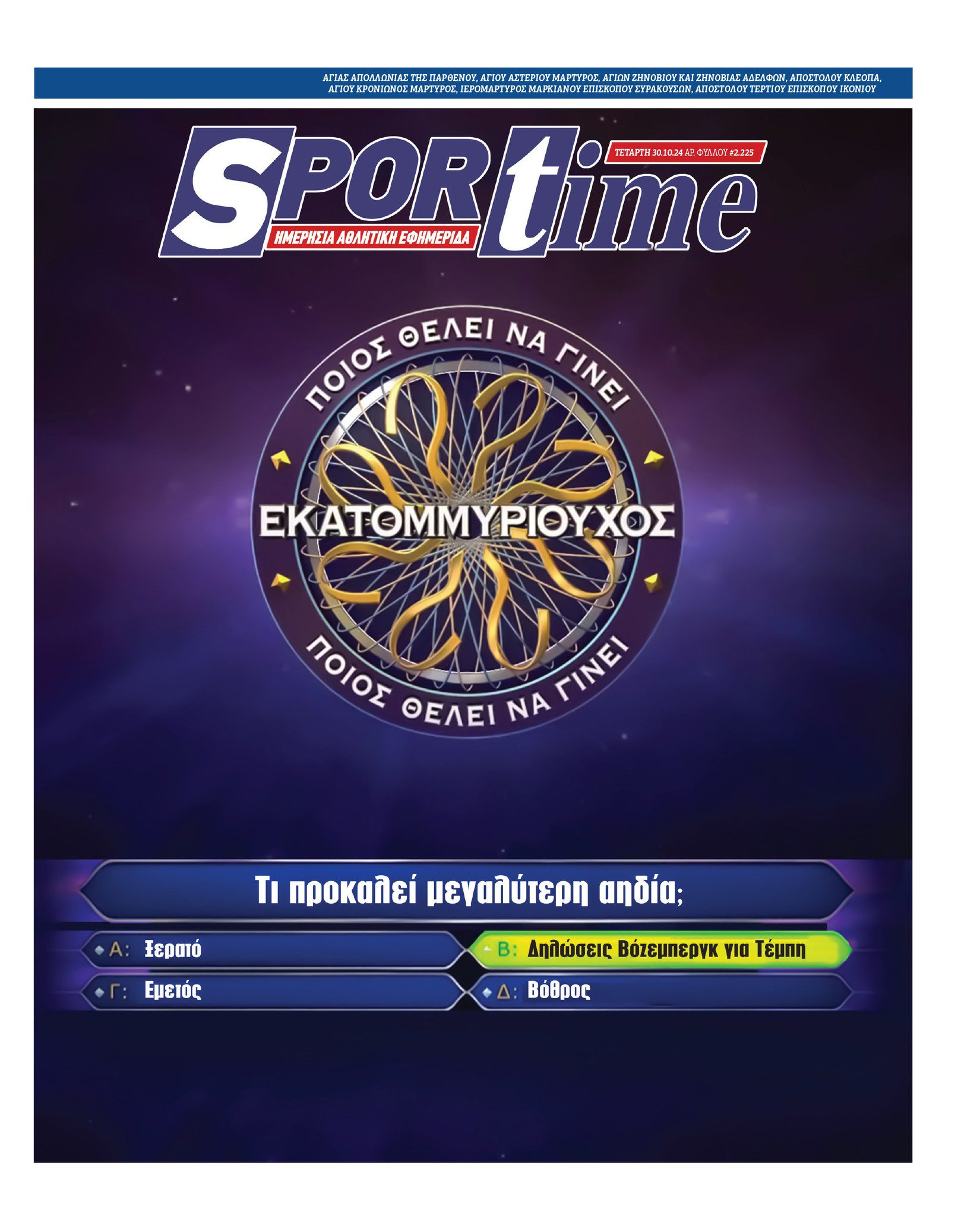 Πρωτοσέλιδα αθλητικών εφημερίδων για την Τετάρτη 30 Οκτωβρίου 2024