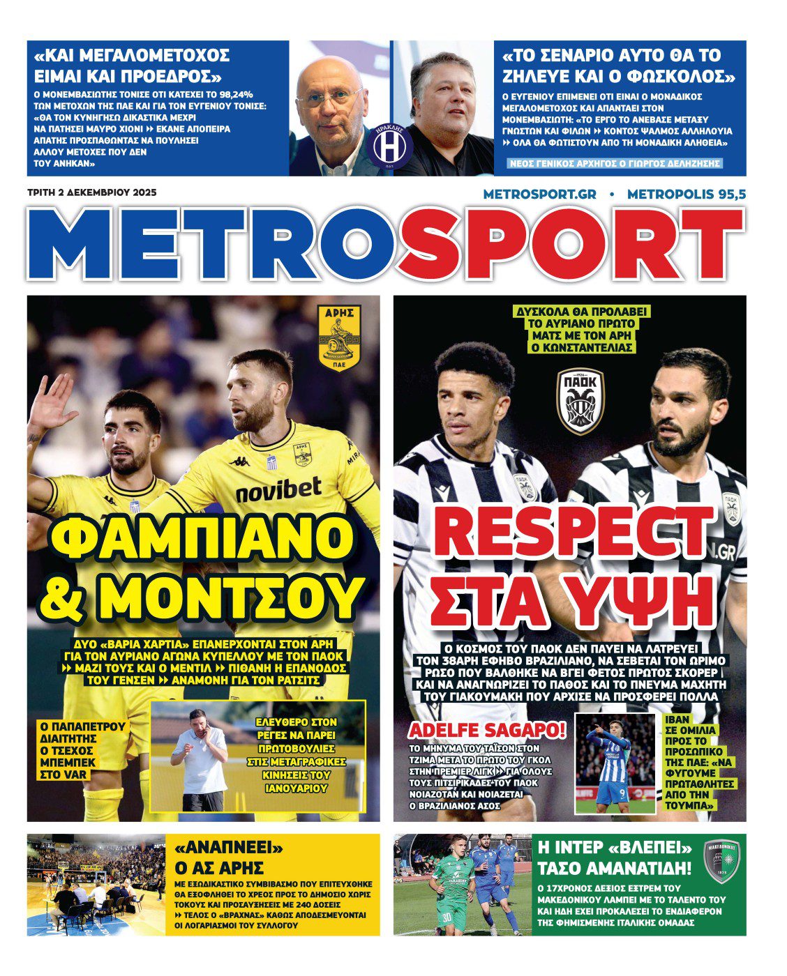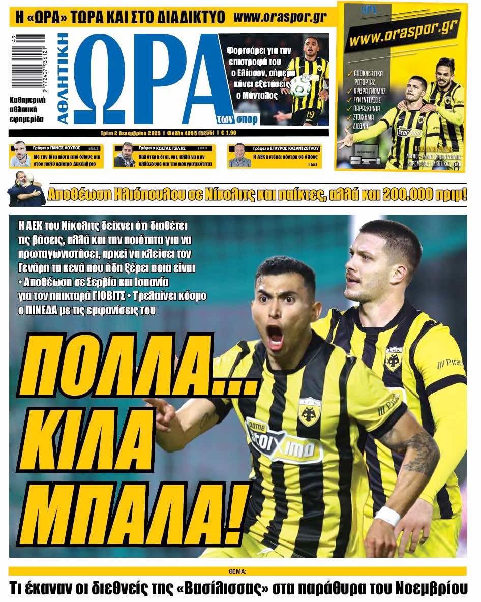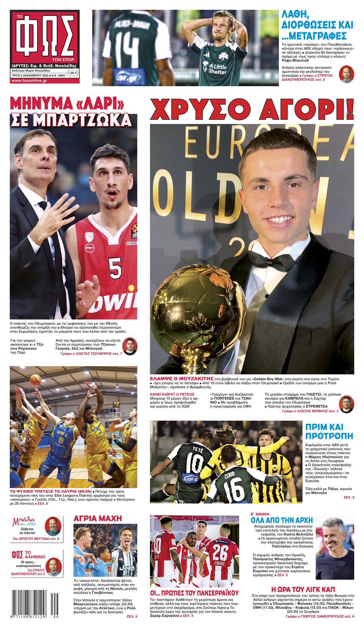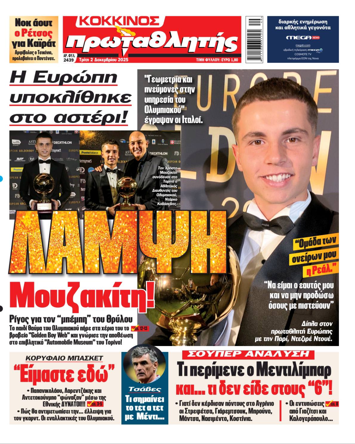 Πρωτοσέλιδα αθλητικών εφημερίδων για την Τρίτη 2 Δεκεμβρίου 2025