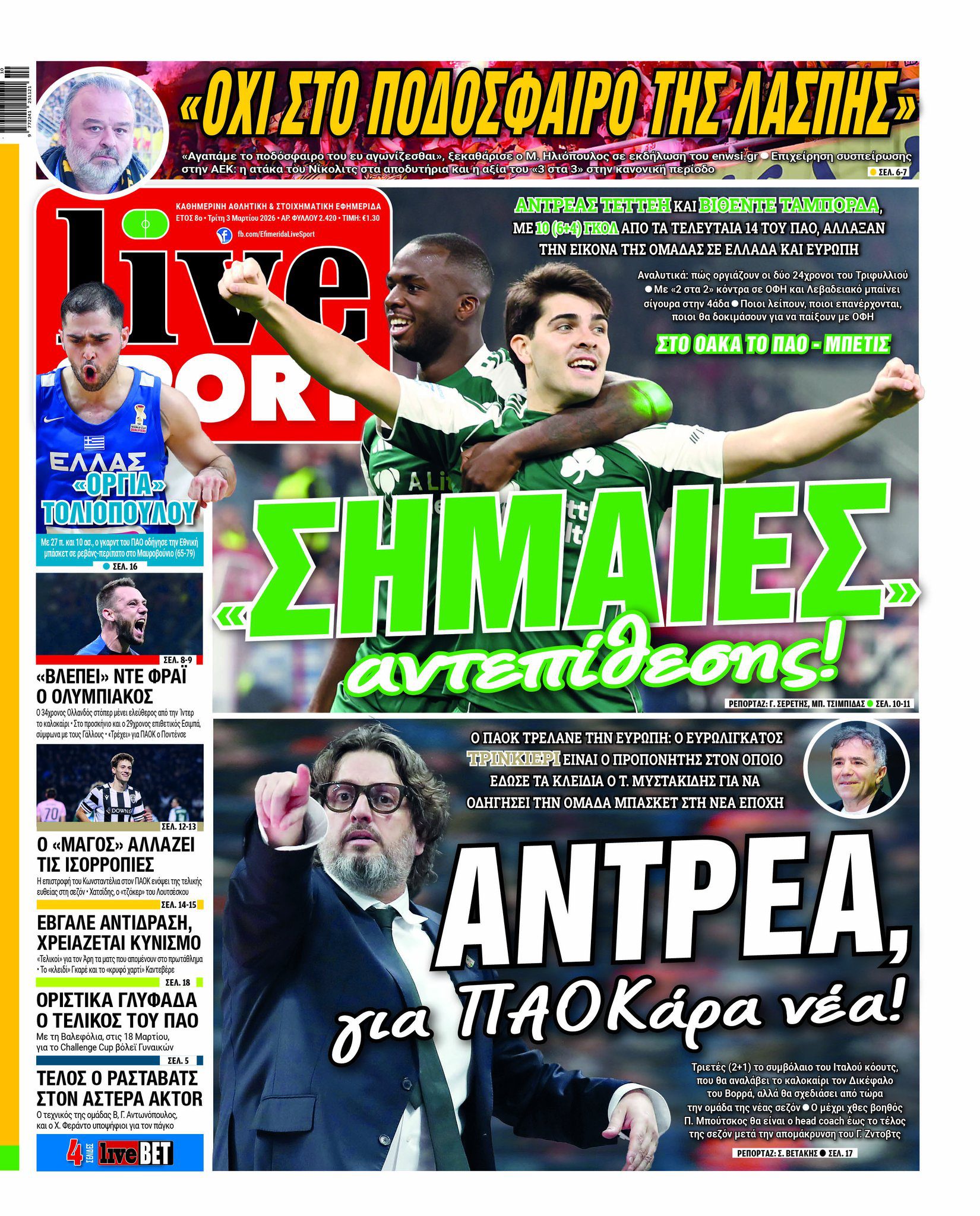 Πρωτοσέλιδα αθλητικών εφημερίδων για την Τρίτη 3 Μαρτίου 2026