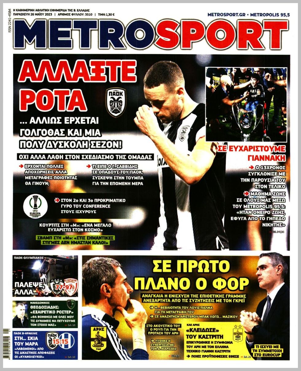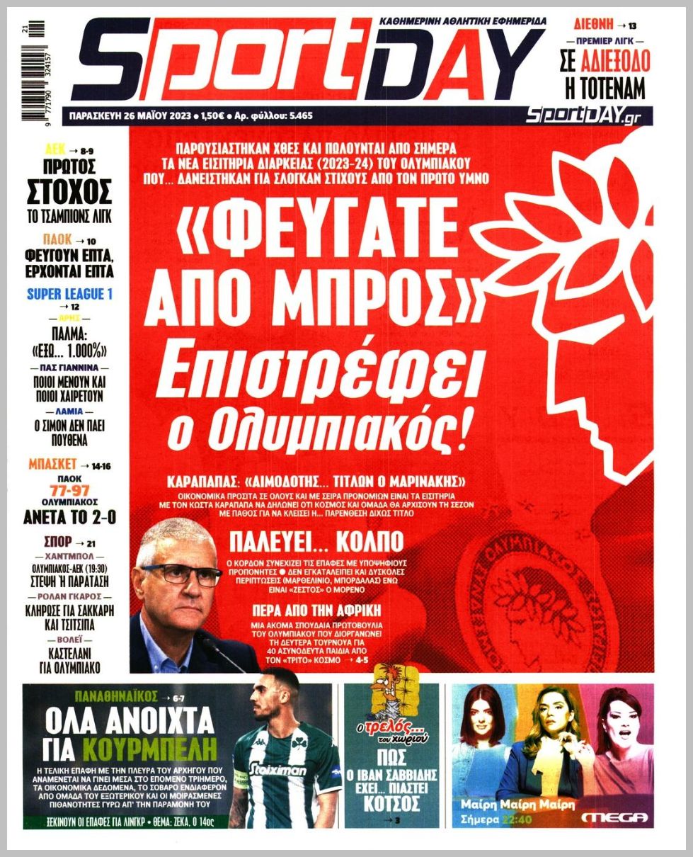 Πρωτοσέλιδα αθλητικών εφημερίδων για την Παρασκευή 26 Μαΐου 2023. Δείτε αναλυτικά τι αναφέρουν στη… βιτρίνα τους οι εφημερίδες.