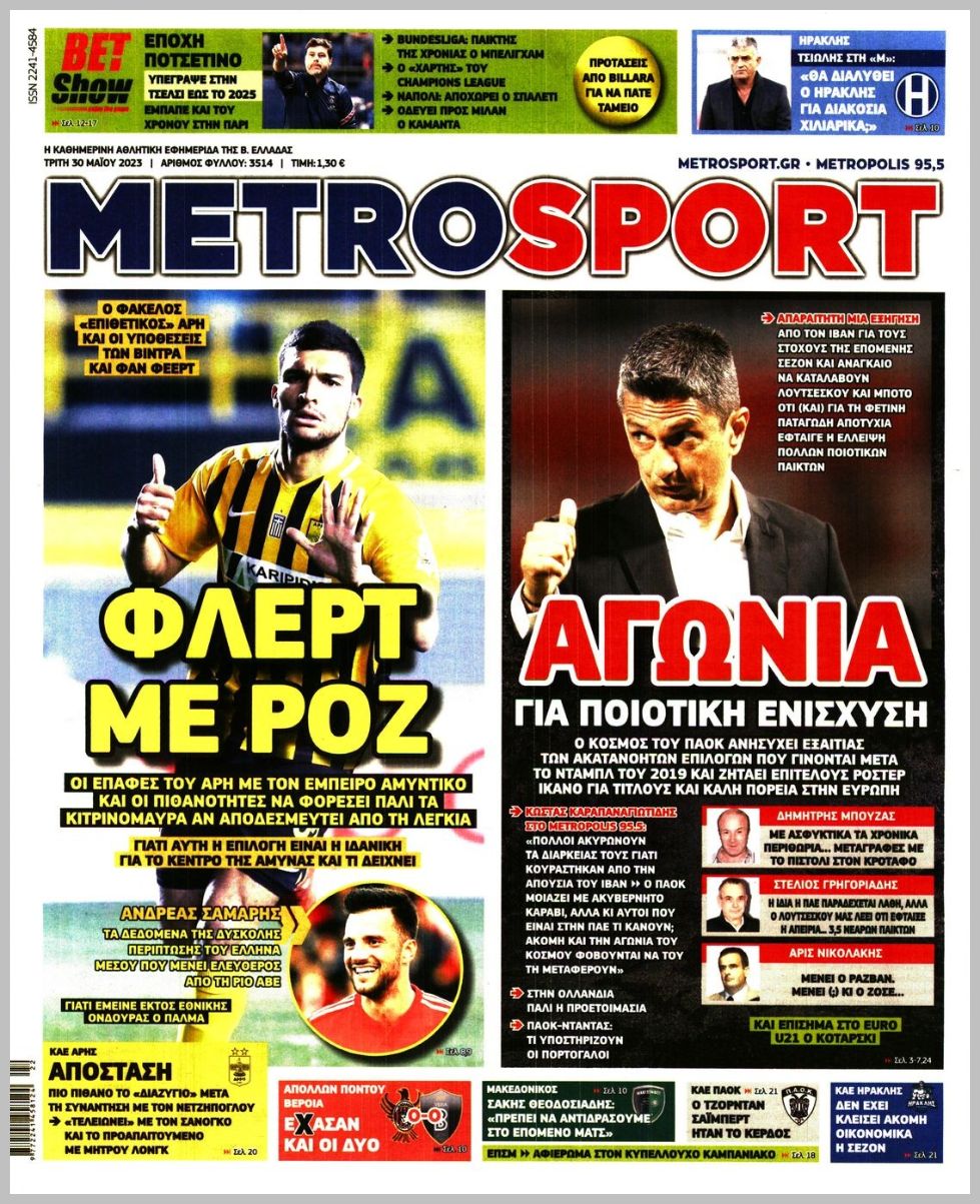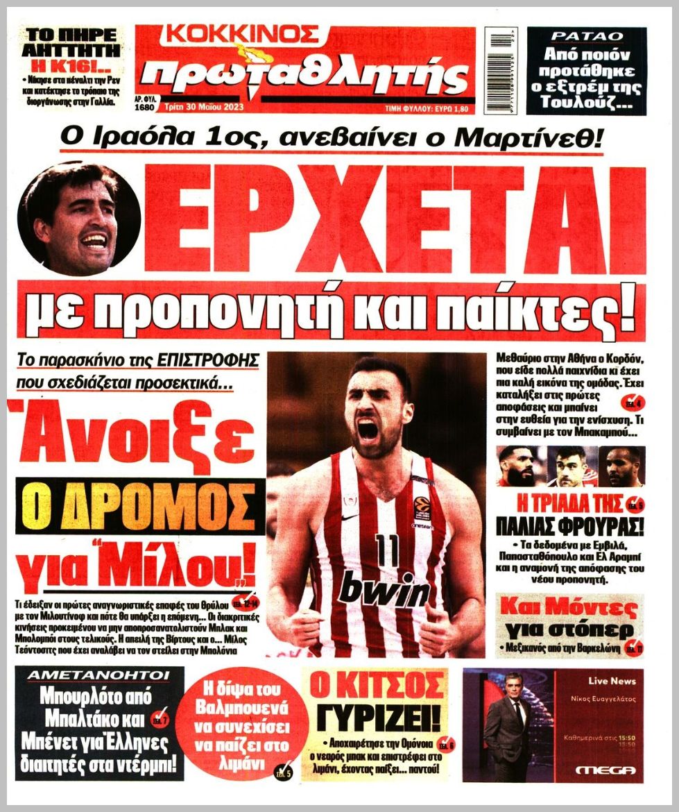 Πρωτοσέλιδα αθλητικών εφημερίδων για την Τρίτη 30 Μαΐου 2023. Δείτε αναλυτικά τι αναφέρουν στη… βιτρίνα τους οι εφημερίδες.