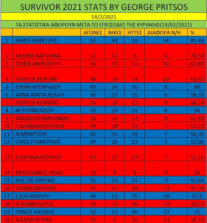 Από εκεί και πέρα μία από τα ίδια. Ο Τζέημς Καφετζής παραμένει ο κορυφαίος παίκτης στο ριάλιτι επιβίωσης του ΣΚΑΪ. Η Καρολίνα ανεβαίνει επικίνδυνη για την κόκκινη ομάδα. Αποτελεί τη δεδομένη στιγμή την καλύτερη παίκτρια. Πριν μας σαρώσει κι εμάς η Κακοκαιρία Μήδεια πάμε να δούμε τα στατιστικά του Γιώργου Πρίτσου.