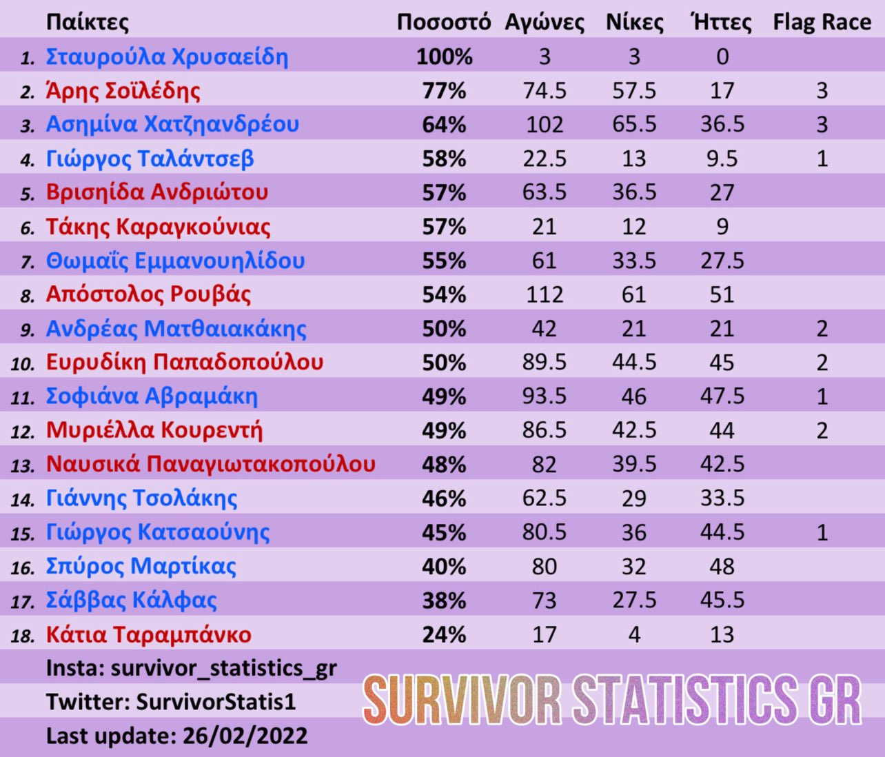 Οι γυναίκες των κόκκινων υποχωρούν σταθερά. Η Κάτια Ταραμπάνκο παραμένει στον πάτο του πίνακα με τα στατιστικά. Στατιστικά και στοιχεία που αλιεύουμε από τις αναρτήσεις που κάνει ο λογαριασμός στο twitter Survivor Statistics GR. Το μοντέλο από την Ουκρανία δεν είναι και στα καλύτερά της και δεν αγωνίζεται. Θα παραμείνει στο παιχνίδι, ή θα αποχωρήσει εξαιτίας των γεγονότων;
