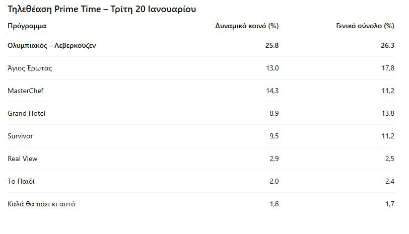 Σε μια βραδιά με ιδιαίτερα σκληρό ανταγωνισμό στην prime time, το Survivor κατάφερε να διατηρήσει σταθερή την παρουσία του, αποδεικνύοντας ότι εξακολουθεί να αποτελεί ένα από τα πιο ανθεκτικά τηλεοπτικά brands της ζώνης.
