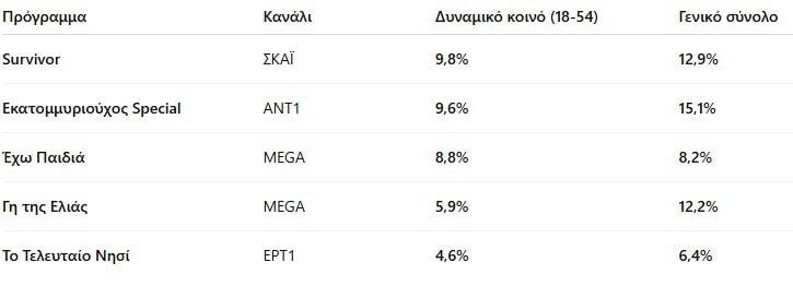 Στο γενικό σύνολο, την πρωτιά πήρε ο Εκατομμυριούχος Special με 15,1%, με το Survivor να ακολουθεί στη δεύτερη θέση με 12,9%, διατηρώντας σταθερή παρουσία και στο ευρύ κοινό. Η Γη της Ελιάς κατέγραψε 12,2%, το Έχω Παιδιά 8,2%, ενώ το Τελευταίο νησί περιορίστηκε στο 6,4%.