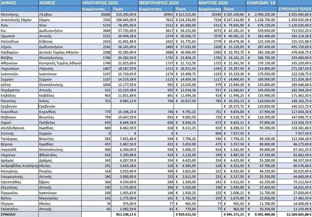 Πιο συγκεκριμένα στα νησιά του Βορείου Αιγαίου, που βιώνουμε τη μέγιστη επιβάρυνση, ο Δήμος Μυτιλήνης συνολικά λαμβάνει € 3,9 εκ, Ανατολικής Σάμου € 1,5 εκ και Χίου € 1,1 εκ. Επισυνάπτεται ο αναλυτικός πίνακας των Δήμων. Θα καταβληθούν αντίστοιχα τέλη για τα υπόλοιπα τρίμηνα του 2020.