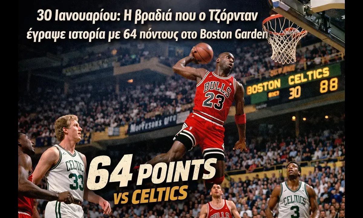 Στις 30/01/1988, ο Μάικλ Τζόρνταν έκανε κάτι που τότε έμοιαζε εξωπραγματικό: Κάρφωσε 64 πόντους απέναντι στους Μπόστον Σέλτικς, μέσα στο θρυλικό Boston Garden.