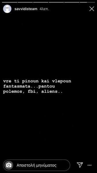 Λίγο αργότερα ανέβασε ακόμα ένα Insta Story, στο οποίο αναφέρθηκε στον «πόλεμο» κατά συγκεκριμένων ομάδων: «Βρε τι πίνουν και βλέπουν φαντάσματα. Παντού πόλεμος, FBΙ, εξωγήινοι».