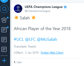 ❓ African Player of the Year 2018#UCL @LFC pic.twitter.com/Zp8mxQLwm2— UEFA Champions League (@ChampionsLeague) January 2, 2019