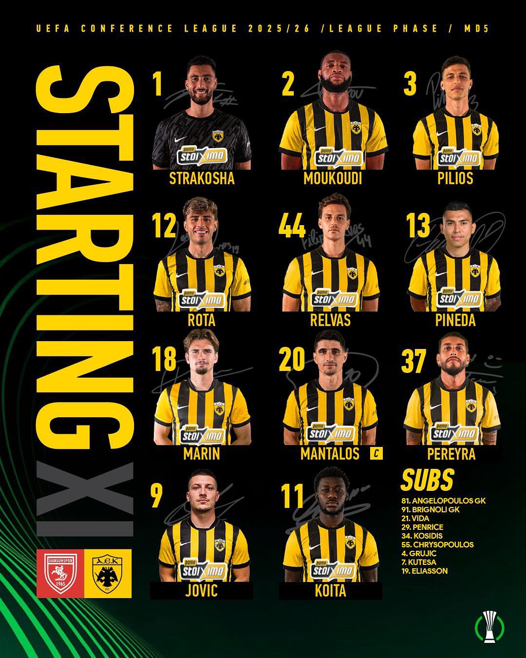 Η ΑΕΚ δίνει σήμερα ένα από τα πιο κρίσιμα παιχνίδια της στη φετινή ευρωπαϊκή της πορεία, αντιμετωπίζοντας στη Σαμψούντα τη Σάμσουνσπορ για την προτελευταία αγωνιστική του Conference League. Λίγο πριν τη σέντρα η ενδεκάδα. Με άλλα λόγια, έγιναν γνωστές οι επιλογές του Μάρκο Νίκολιτς για την ενδεκάδα που θα παρατάξει στην Τουρκία.