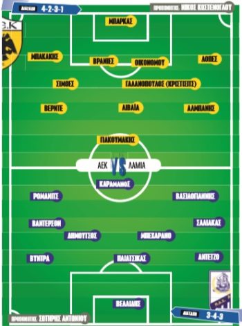 Όσον αφορά στα αγωνιστικά της ΑΕΚ, ο Νίκος Κωστένογλου που άλλαξε πολλά στην ΑΕΚ, έστησε τα πλάνα του χωρίς τους Νέλσον Ολιβέιρα και Πέτρο Μάνταλο που συνεχίζουν τις θεραπείες τους με στόχο να επιστρέψουν το συντομότερο δυνατόν. Επίσης από την αποστολή για την σημερινή αναμέτρηση απουσίαζε και το όνομα του Ντμίτρο Τσιγκρίνσκι. Ο Έλληνας τεχνικός αναμένεται να αλλάξει αρκετά την ομάδα του σε σχέση με τα προηγούμενα παιχνίδια και αυτό οφείλεται σε μεγάλο βαθμό και στη Λαμία. Οι Φθιώτες παίζουν με σύστημα 4-5-1 και ως εκ τούτου η τριάδα στην άμυνα είναι αχρείαστη για την Ένωση. Το πιθανότερο σενάριο είναι η Ένωση να παραταχθεί με διάταξη 4-2-3-1 στο ΟΑΚΑ. Κάτω από τα δοκάρια θα είναι ο Μπάρκας, ενώ το αμυντικό δίδυμο θα απαρτίζεται από τους Βράνιες-Οικονόμου μιας και ο Τσιγκρίνσκι είναι εκτός. Στα μπακ θα πάρουν θέση οι Μπακάκης-Χουλτ, ενώ οι Σιμόες-Γαλανόπουλος θα ξεκινήσουν κατά πάσα πιθανότητα στον άξονα. Όσον αφορά τις θέσεις τις επίθεσης, στα άκρα αναμένονται οι Βέρντε και Αλμπάνης με τον Λιβάγια πίσω από τον Γιακουμάκη.