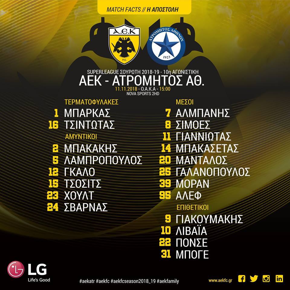 Τους παίκτες με τους οποίους θα πάει η ΑΕΚ κόντρα στο παιχνίδι με τον Ατρόμητο ανακοίνωσε ο Μαρίνος Ουζουνίδης. Δύο σημαντικές επιστροφές για την Ένωση και μια απουσία.