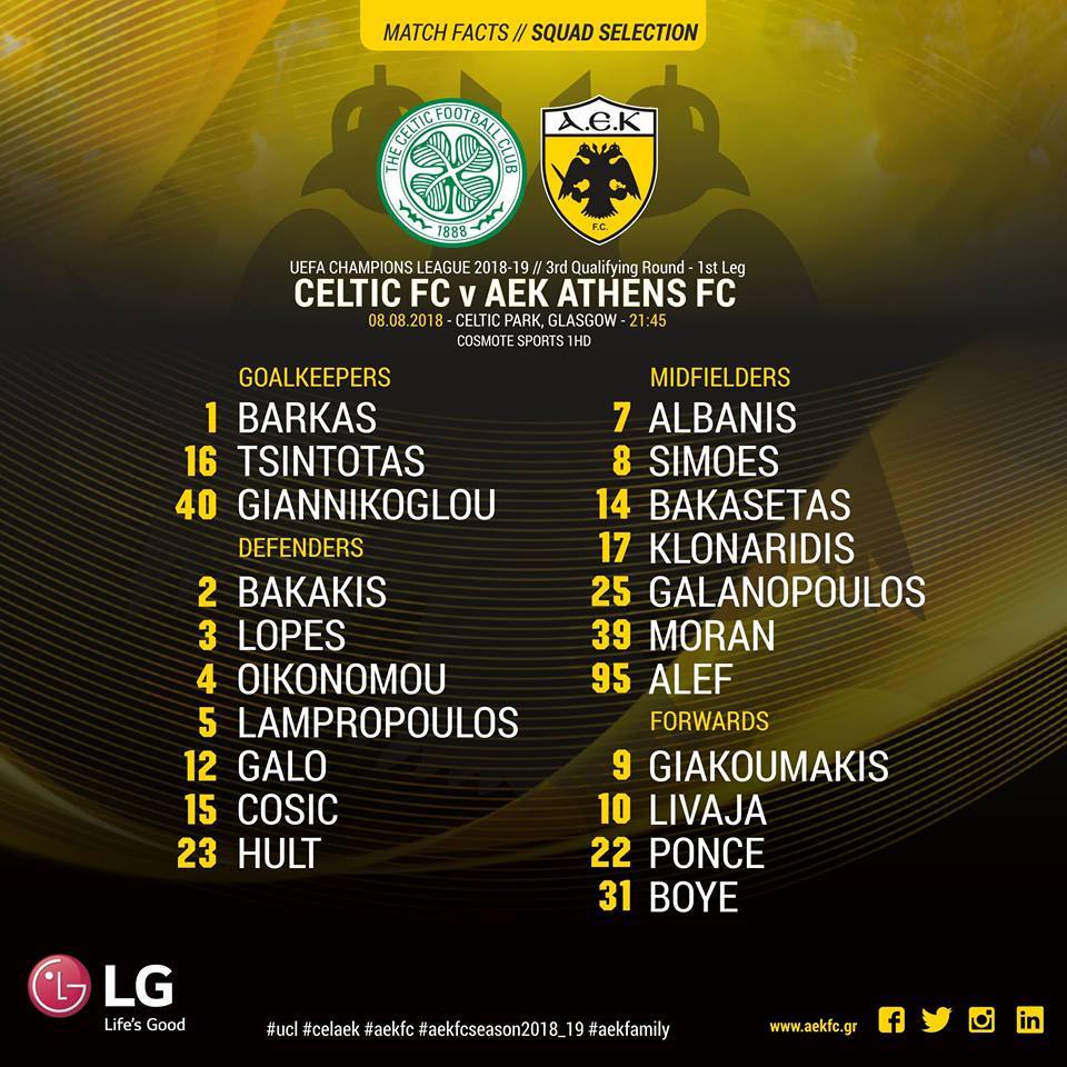 Στη Γλασκώβη η ΑΕΚ πάει με 21 παίκτες, εκ των οποίων οι 3 τερματοφύλακες.