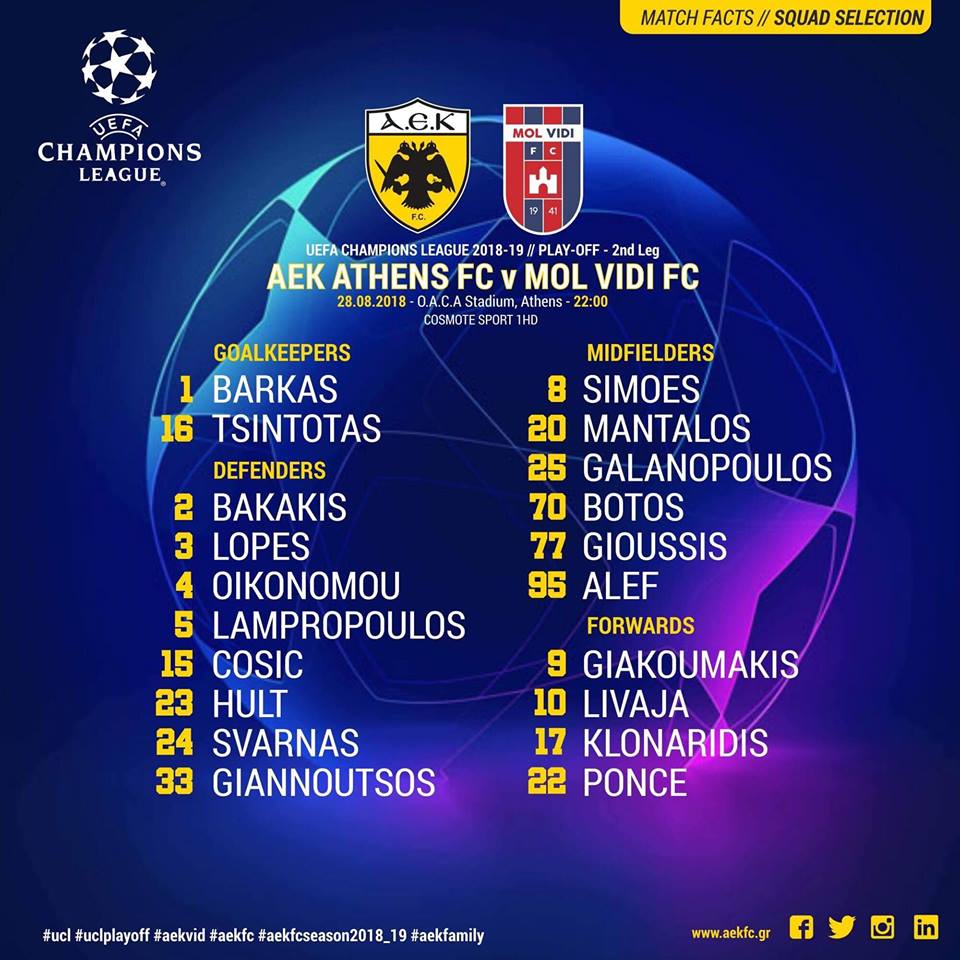 Με 20 ποδοσφαιριστές στην αποστολή, η ΑΕΚ ετοιμάζεται για την αναμέτρηση της Τρίτης (28/8) με τη Βίντι για τα play-off του Champions League.