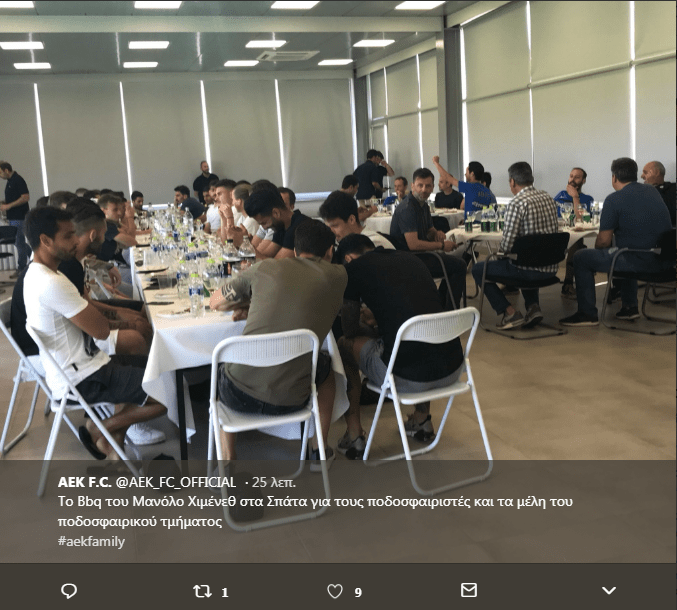 O Ανδαλουσιάνος τεχνικός, ανέλαβε ρόλο ψήστη, άφησε τους παίκτες να περιμένουν στα τραπέζια και κάτι…ψήθηκε στα Σπάτα. Η ΑΕΚ στον επίσημο λογαριασμό της στο Twitter, ανέβασε μια φωτογραφία με το ρόστερ και τα στελέχη των “κιτρινόμαυρων” στην αίθουσα… αναμονής.