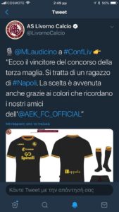 Ιδού ο νικητής του διαγωνισμού της τρίτης φανέλας. Πρόκειται για ένα αγόρι από τη Νάπολι. Η επιλογή έγινε και λόγω των χρωμάτων που θυμίζουν τους φίλους μας, αυτά της ΑΕΚ” ανέφερε χαρακτηριστικά η ανάρτηση της Λιβόρνο στο Twitter.