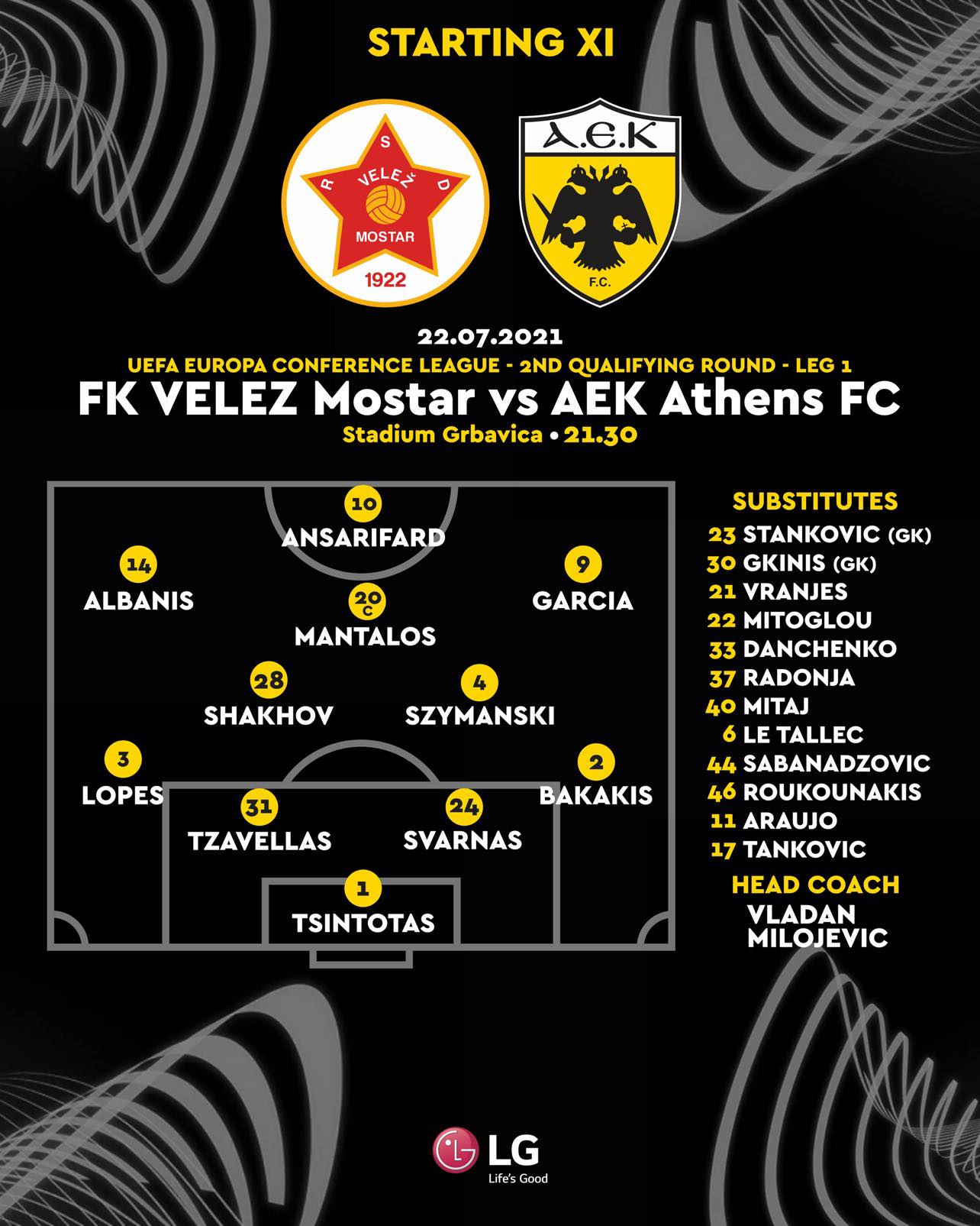 Η ΑΕΚ παίζει (21.30) με την Βελέζ στο Σαράγεβο για τον Β’ προκριματικό γύρο του Conference League και θέλει να κλειδώσει από απόψε την πρόκριση ενόψει της ρεβάνς την επόμενη εβδομάδα στο ΟΑΚΑ.