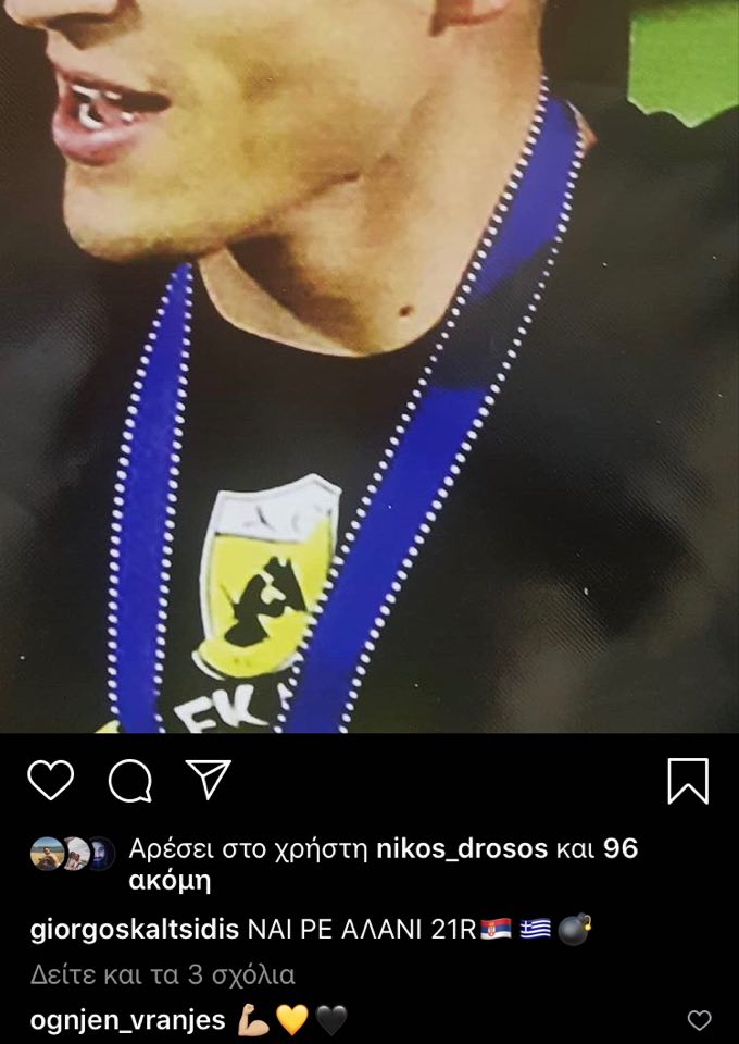 Όπως φαίνεται και στην παρακάτω φωτογραφία του Γιώργου Καλτσίδη (υπάλληλος του ποδοσφαιρικού τμήματος) με τον Βράνιες να φορά t-shirt της ΑΕΚ και το μετάλλιο του Πρωταθλήματος το 2018 και να του γράφει «Ναι, ρε Αλάνι 21», ο Ογκνιεν Βράνιες απαντά με «κιτρινόμαυρες» καρδιές!