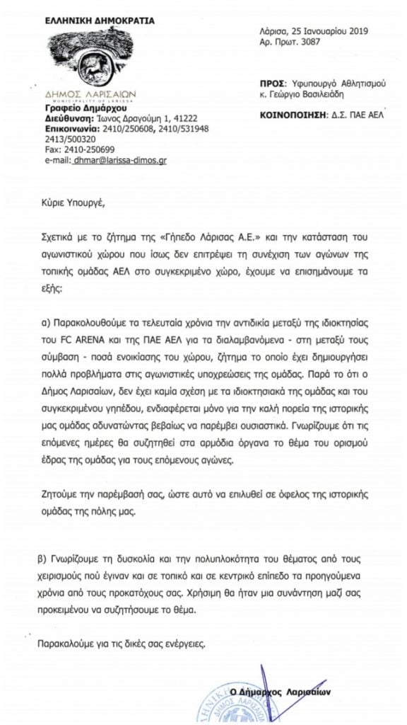 ΑΕΛ: Επιστολή του Δημάρχου στον Βασιλειάδη για το γήπεδο (pic)