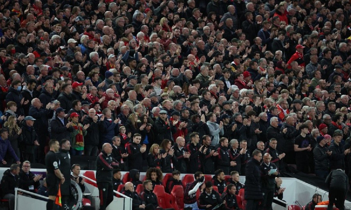 Οι φίλοι της Λίβερπουλ είχαν γνωστοποιήσει για την πρόθεσή τους. Τελικά έγινε και πράξη αυτό. Μόλις μπήκε το ματς στο 7ο λεπτό, όλοι σηκώθηκαν και άρχισαν να χειροκροτούν. Με αυτό τον τρόπο έδειξαν πως είναι κοντά στον Πορτογάλο για ό,τι βιώνει. Μαζί τους χειροκροτούσαν και οι φίλοι της Μάντσεστερ Γιουνάιτεντ.