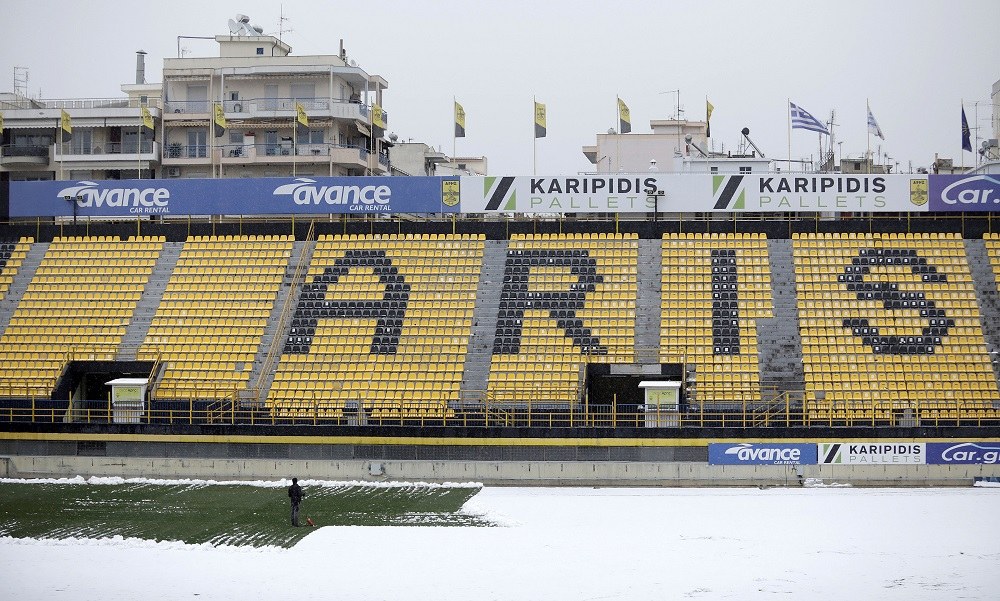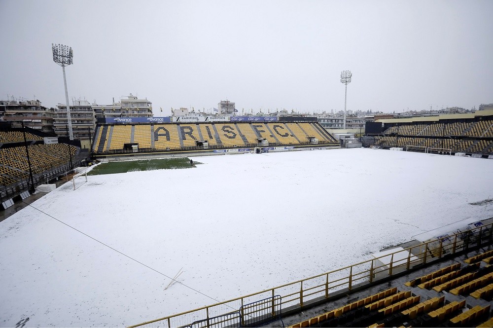 Οι παίκτες του Σάββα Παντελίδη κατέφθασαν σε ένα κάτασπρο από το χιόνι «Κλεάνθης Βικελίδης», το οποίο όμως καθαρίστηκε, προκειμένου οι «κίτρινοι» να προπονηθούν.
