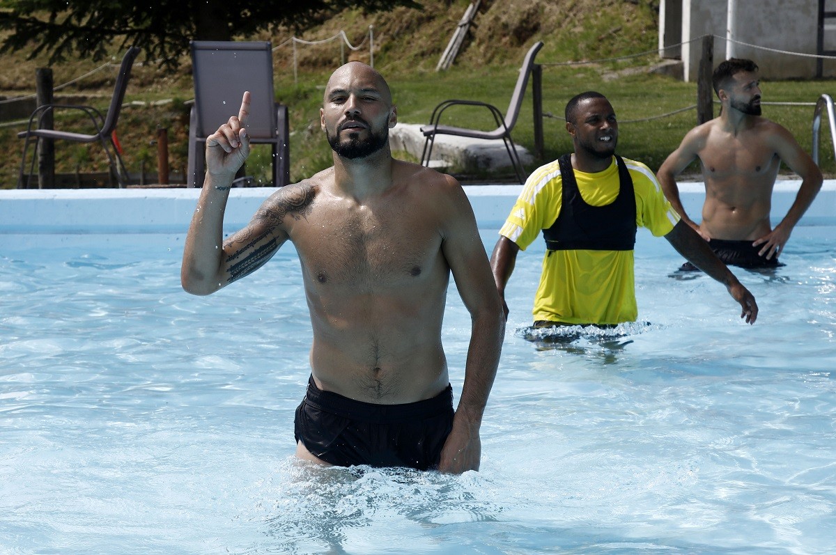 Φυσικά υπάρχουν και οι στιγμές χαλάρωσης τις οποίες οι ποδοσφαιριστές απολαμβάνουν στην πισίνα που διαθέτει το ξενοδοχείο/προπονητική κέντρο στο οποίο έχουν καταλύσει.