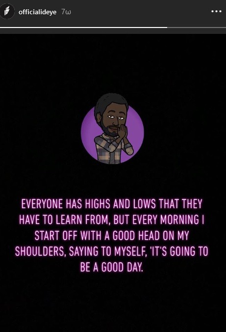 Μία μέρα μετά το ματς με τον Ολυμπιακό στο Φάληρο, ο 31χρονος Ιντέγε θέλησε να τοποθετηθεί μέσω του λογαριασμού του στο Instagram: «Καθένας έχει τα πάνω και τα κάτω του και πρέπει να μαθαίνει από αυτά, αλλά κάθε πρωί ξεκινώ με μια καλή σκέψη λέγοντας στον εαυτό μου πως σήμερα θα είναι μια καλή μέρα», ήταν όσα έγραψε ο Ιντέγε.