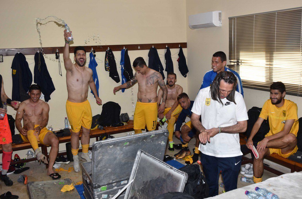 Αναμενόμενη η εκτόνωση και το ξέσπασμα της ανακούφισης από τα μέλη της αποστολής του Άρη μετά το τέλος του αγώνα στην Άρτα και τη μαθηματική επικύρωση της ανόδου στη Super League. Οι παίκτες του Άρη… ξέσπασαν με μπουγέλο μέσα στ’ αποδυτήρια του γηπέδου.