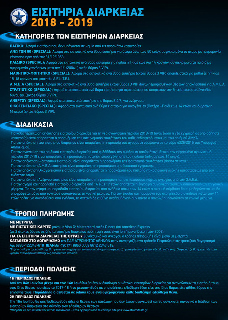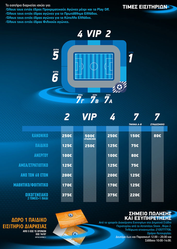 Σημείο πώλησης και εξυπηρέτησης θα είναι το γραφείο Διαχείρισης Εισιτηρίων στο Δημοτικό Στάδιο Περιστερίου (είσοδος από Atromitos store, Θύρα 2), τηλέφωνο επικοινωνίας 2105777706. Ωράριο λειτουργίας Δευτέρα έως και Παρασκευή 12.00 – 20.00 και Σάββατο 10:00-14:00”.