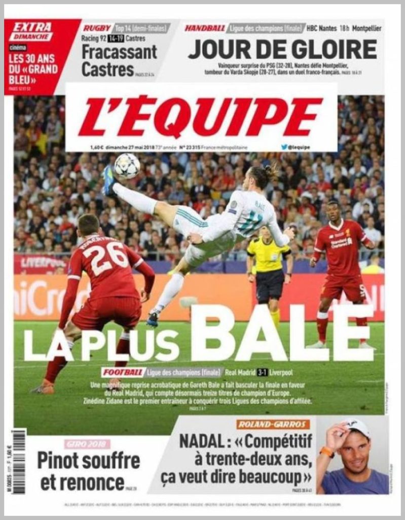 Η «Gazzetta» στάθηκε στον Μπέιλ, αλλά και στον Ρονάλντο με τίτλο: «Bale Show, CR7 Shock», η «Equipe» είχε πρωτοσέλιδο το ανάποδο ψαλιδάκι του Μπέιλ με τίτλο «La Plus Bale», ενώ η «Daily Mail» έγραψε «Έκσταση» με τον Μπέιλ να πανηγυρίζει.