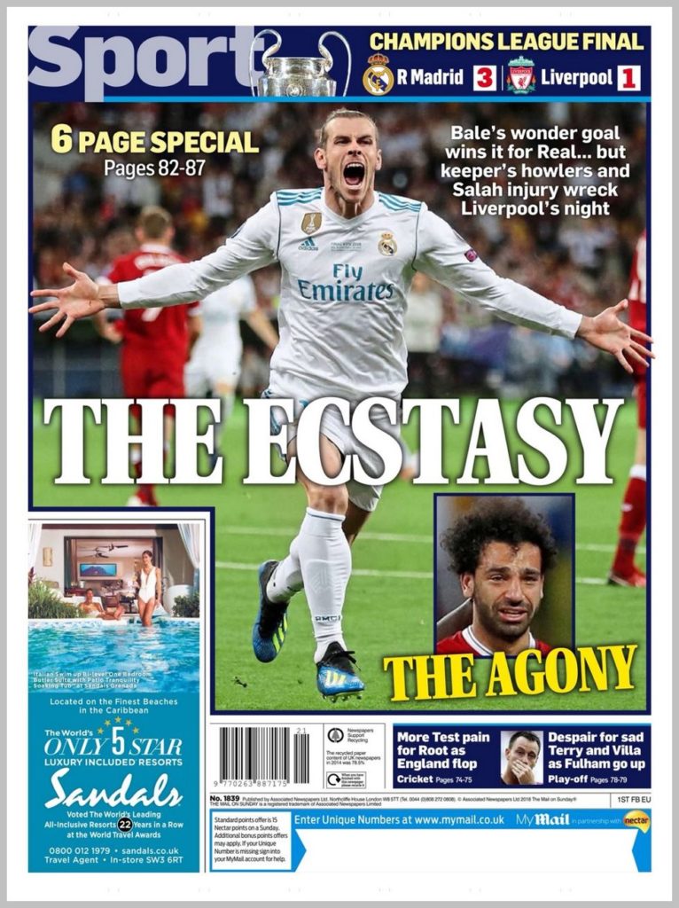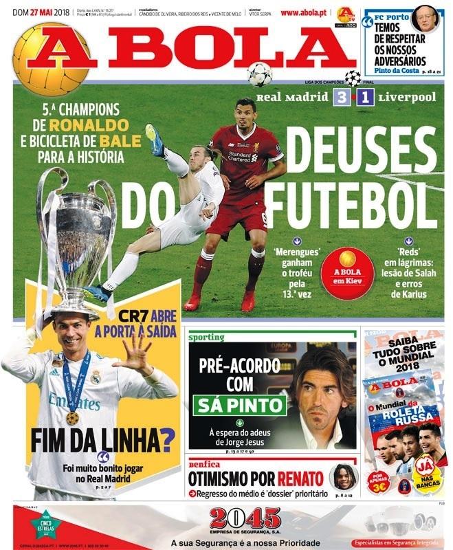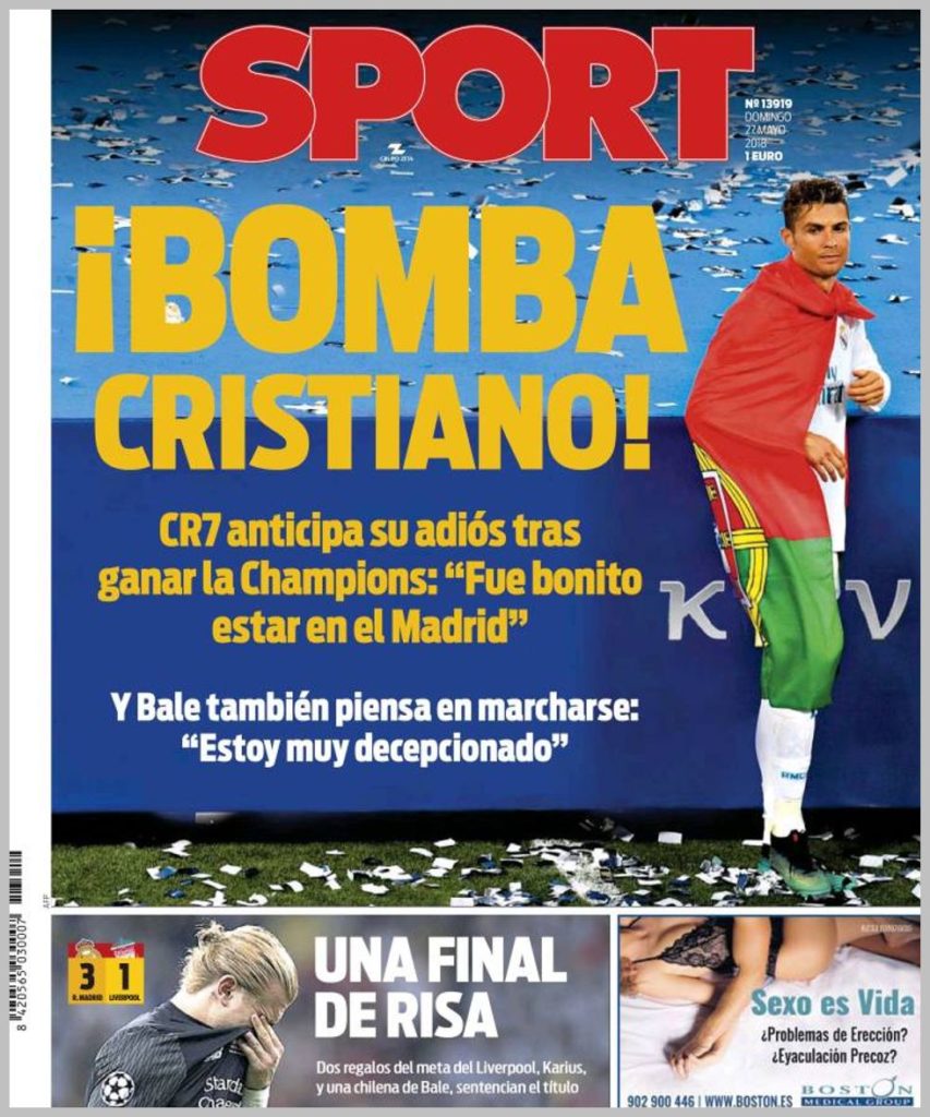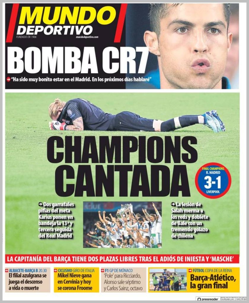 Αντίθετα, η καταλανική «Sport» δεν θα μπορούσε να προτάξει τόσο πολύ τον 13ο τίτλο της Ρεάλ, όσο το σαφές υπονοούμενο του Ρονάλντο ότι αυτή ήταν η τελευταία του χρονιά στη Ρεάλ. «Βόμβα Κριστιάνο» ήταν ο τίτλος, ενώ από κάτω είχε φωτογραφία του απαρηγόρητου Κάριους με τίτλο «Una final de risa», δηλαδή ένα τελικός για… γέλια! Στο ίδιο μήκος κύματος και η «Mundo Deportivo» της Βαρκελώνης με τον Κάριους πεσμένο στο έδαφος και τίτλο «Champions Cantada».