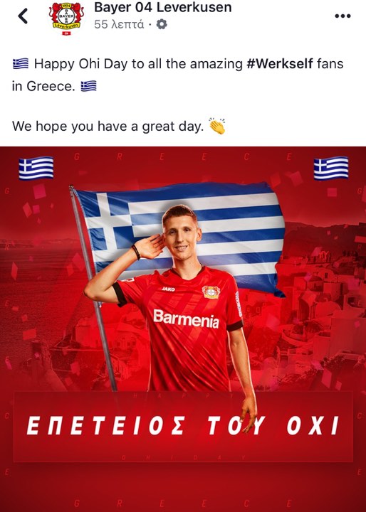 Η Μπάγερ Λεβερκούζεν με μήνυμά της στα social media τίμησε τη επέτειο του «ΟΧΙ» αναρτώντας μία φωτογραφία με την ελληνική σημαία και τον Παναγιώτη Ρέτσο.