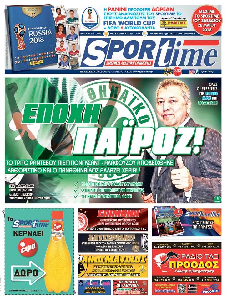 Το Sportime ήταν το μοναδικό Μέσο, που στο πρωτοσέλιδο της Παρασκευής (25/5) αποκάλυπτε την οριστική συμφωνία Αλαφούζου-Πιεμπονγκσάντ, με τον Ταϊλανδό πλέον να είναι αυτός που έχει στα χέρια του, ήδη, τον Παναθηναϊκό!