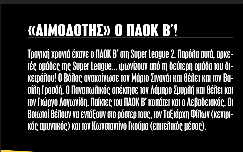 Επιβεβαίωση Sportime: Διπλή ενίσχυση από ΠΑΟΚ Β’ ο Λεβαδειακός και παραμονή Τσοκάι