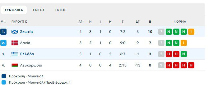 Να ξεκινήσουμε από τα βασικά. Η Εθνική Ελλάδας με ήττα από τη Δανία αποκλείεται και μαθηματικά. Η Σκωτία έχει 10 βαθμούς, η Δανία θα φτάσει στους 10, επομένως… τελειώνει το θέμα. Με ισοπαλία η Ελλάδα μένει ζωντανή έχοντας δύσκολο έργο βέβαια στη συνέχεια. Δεν είναι απλώς μαθηματικές οι ελπίδες, αλλά είναι ζόρικο να πάρει την 2η θέση.