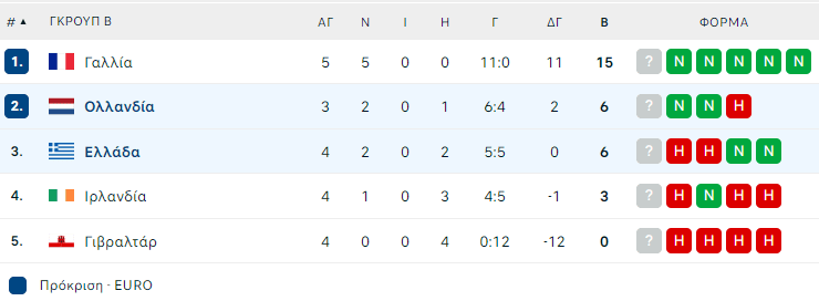 Εθνική Ελλάδας: Η βαθμολογία του ομίλου μετά την ήττα από την Ολλανδία